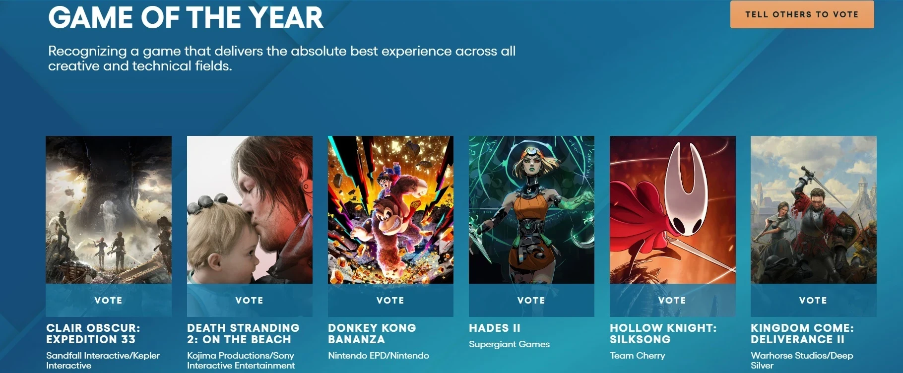 По словам Уильяма Пеллена, Team Cherry, возможно не приедет на TGA в Лос-Анджелес из-за большой занятости. На комментарий Шрайера о том, что разработчикам придётся записывать видеообращение на случай победы, Ари Гибсон заявил: «В этом году, думаю, нас пронесёт». А победит (видимо, в главной категории) Clair Obscur: Expedition 33.