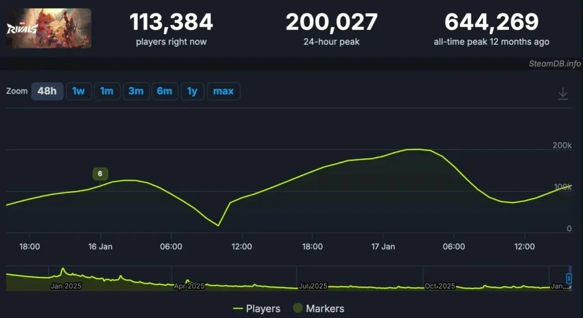 В ночь на 17 января в версии для платформы Valve одновременно находилось более 200 тысяч игроков — пиковое значение составило 200 027 человек. И это только Steam: Marvel Rivals также доступна на консолях PlayStation и Xbox, где у проекта тоже внушительная аудитория.