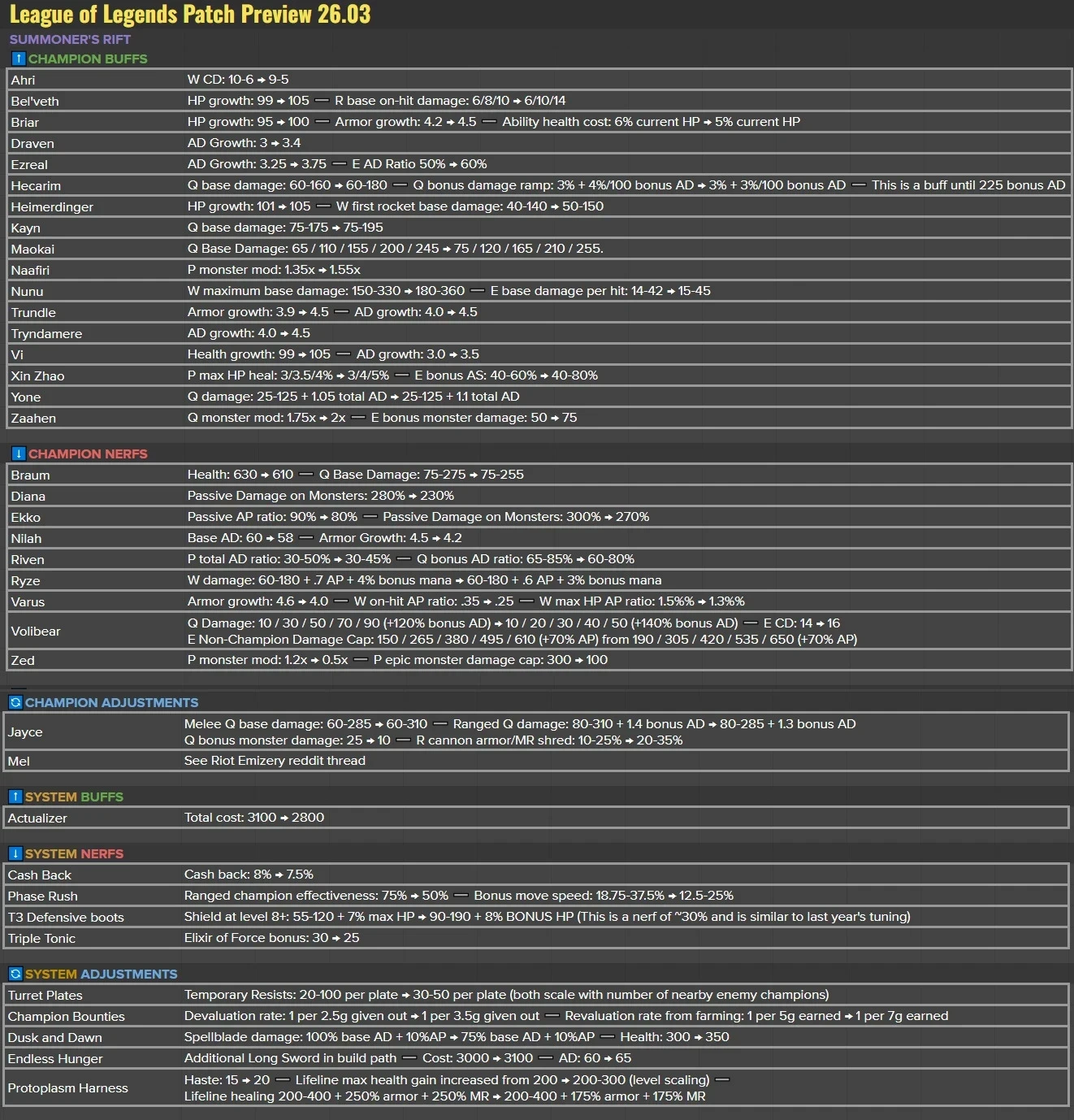 Патч принесет частичную переработку чемпиона Mel (подробности будут в отдельном треде). Также изменится предмет Actualizer (стоимость снижена с 3100 до 2800), а руна Phase Rushстанет слабее для чемпионов дальнего боя.