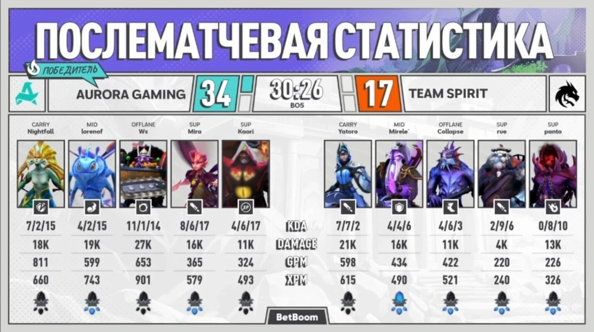 • Керри Aurora Егор Григоренко на Phantom Assassin отстал от оппонента более чем на 10 тысяч золота и закончил игру со статистикой 5/5/11.