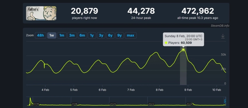 Начнём с Fallout 4 — последней однопользовательской части серии. 8 февраля пиковый онлайн игры в Steam превысил 60 тысяч человек. В последний раз аналогичные показатели наблюдались лишь летом 2024 года. При этом в апреле того же года в постапокалиптической RPG находилось более 187 тысяч игроков — всё благодаря старту первого сезона «Фоллаута».