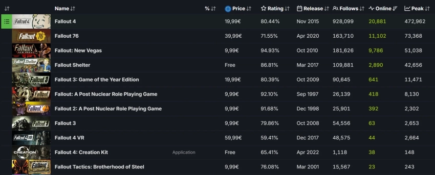 У многопользовательской Fallout 76 онлайн также находится на рекордных показателях за последнее время. 1 февраля в игре находилось свыше 33 тысяч геймеров одновременно. В апреле 2024 года игра привлекла более 73 тысяч человек на пике онлайна в Steam.