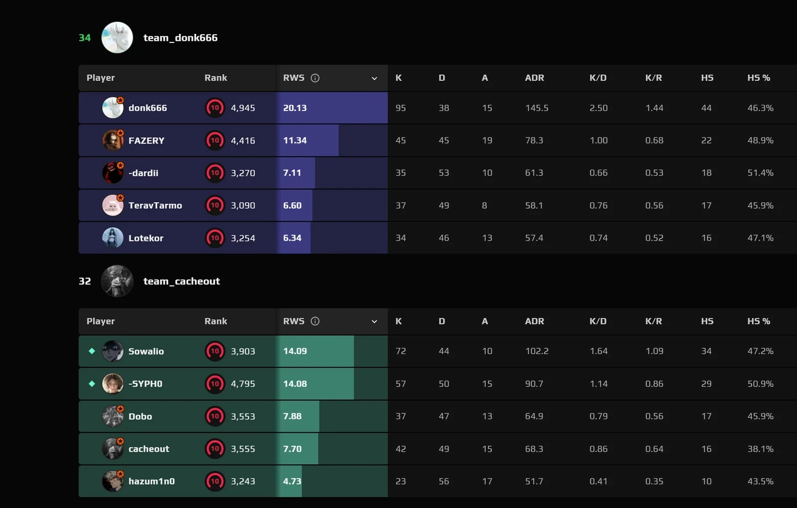 Показатель среднего урона за раунд (ADR) составил колоссальные 145.5. Суммарно за игру он нанес почти 10 тысяч единиц урона и успел оформить красивый эйс. Разрыв по импакту с тиммейтами оказался катастрофическим: ближайший преследователь по команде с ником «FAZERY» набил всего 45 фрагов.