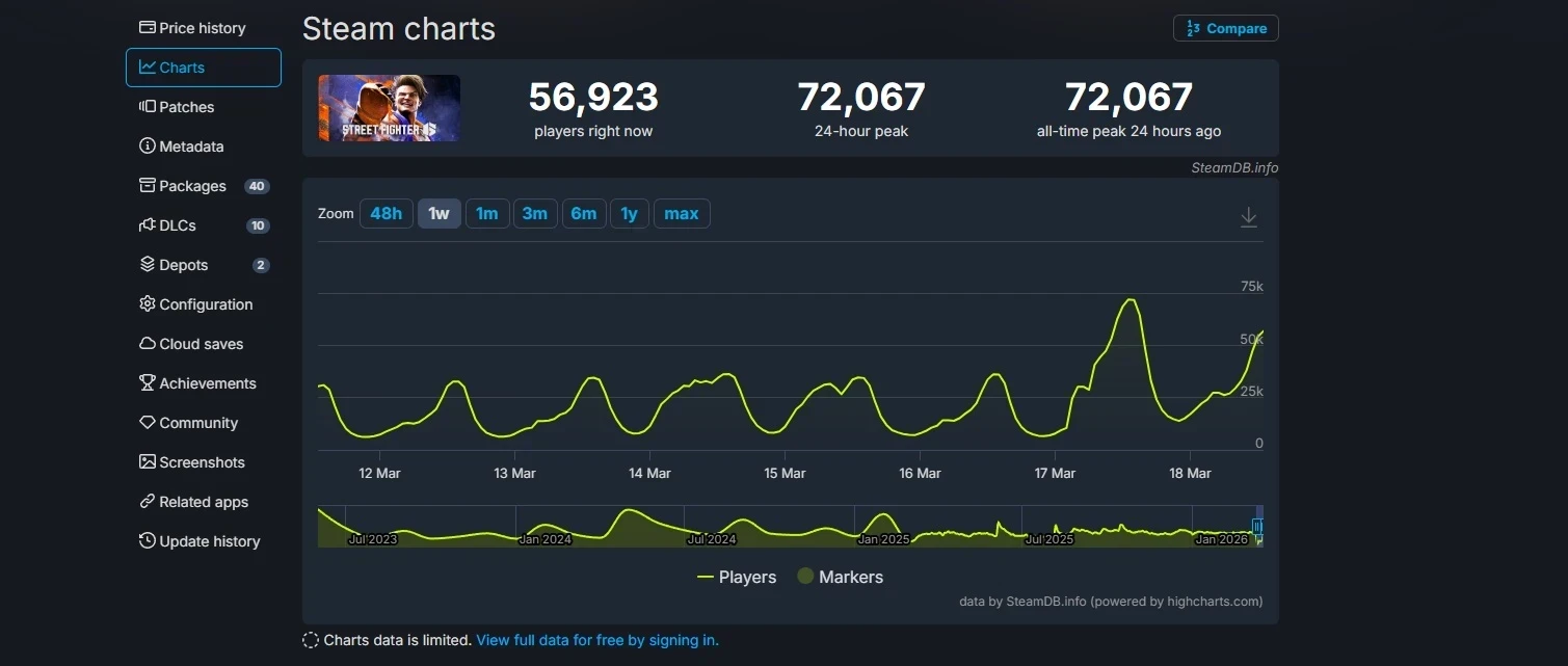 Обложка: кадр трейлера Street Fighter 6Street Fighter 6 показала рекордный пиковый онлайн в Steam с момента релиза — 72 067 человек. Это случилось 17 марта вскоре после выхода свежего обновления. Оно привнесло нового мощного бойца Алекса и другой дополнительный контент.