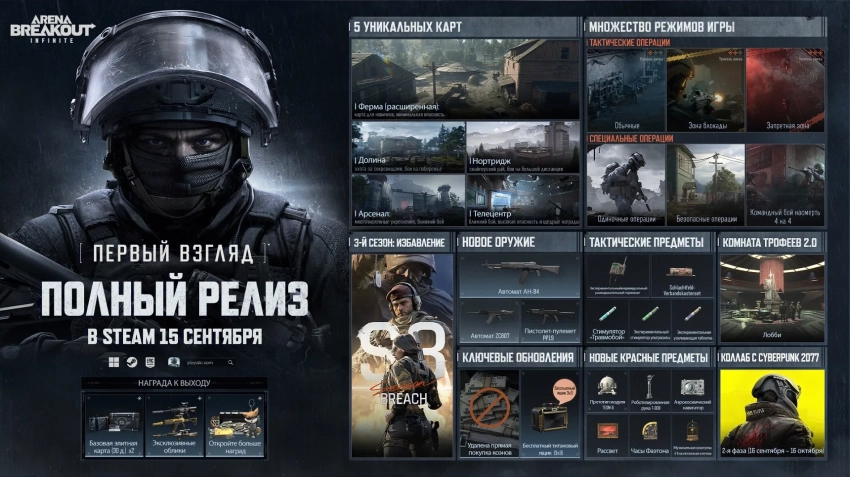 Полноценная версия Arena Breakout: Infinite предлагает 5 уникальных карт, несколько режимов, свыше 70 видов оружия и свыше 1000 аксессуаров, а также усиленную систему борьбы с читерами, изменённый баланс предметов высокого уровня многое другое.