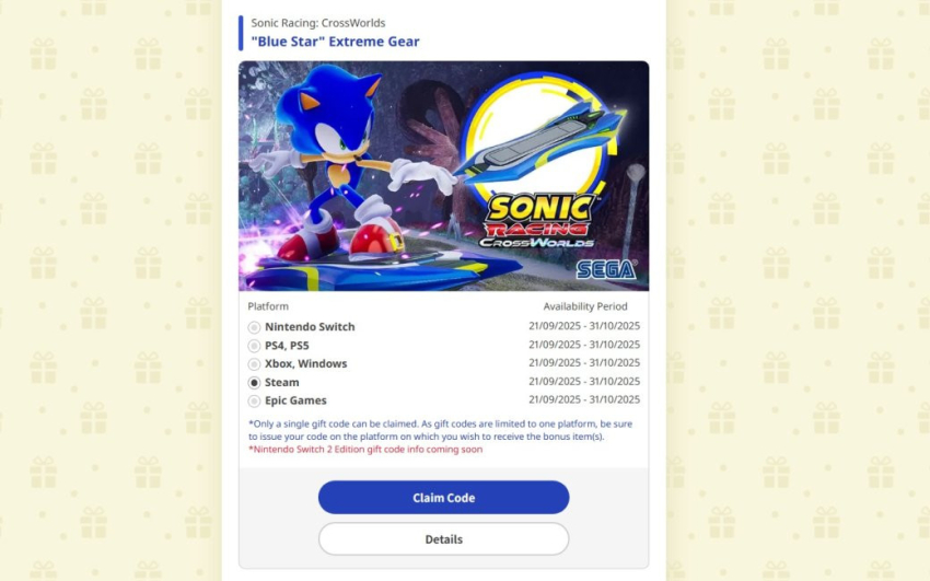 Важно: подарочные коды Sonic Racing: CrossWorlds ограничены одной платформой (дают только на одну). Версии для Switch 2 в настоящее время недоступны — они появятся позднее.