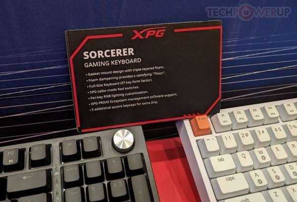 XPG также оставила немного места на стенде для своей новой линейки игровых клавиатур Sorcerer — стандартная модель представляет собой «полноразмерную» плату с форм-фактором 96 %, доступную в черном или белом цвете. Простая эстетика Sorcerer может быть нарушена несколькими (тремя) дополнительными клавишами с акцентом XPG. Серебристый диск управления, похоже, является стандартным креплением. Конструкция с прокладкой и тройным пенополиуретановым слоем обеспечивает изысканный и приятный набор текста. XPG оснастила Sorcerer специальными переключателями Red и системой RGB-подсветки на каждую клавишу (управляется и настраивается с помощью программного обеспечения XPG Prime).