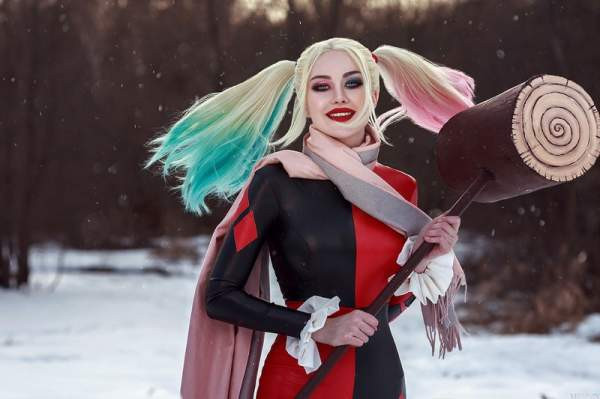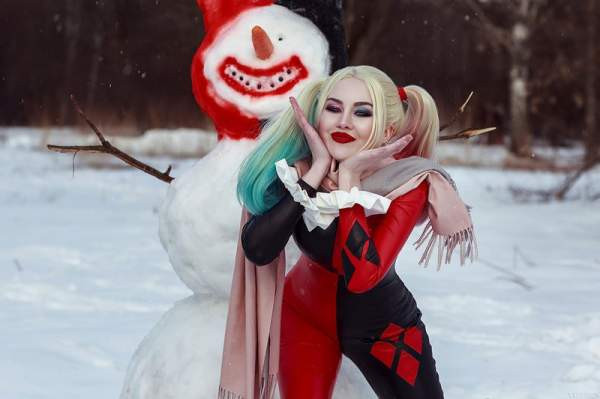 Редкое сочетание: Харли Квинн и зима. В Готэме снег редкое явление, тем более полноценные сугробы. У Виктории Кот вышел креативных образ.