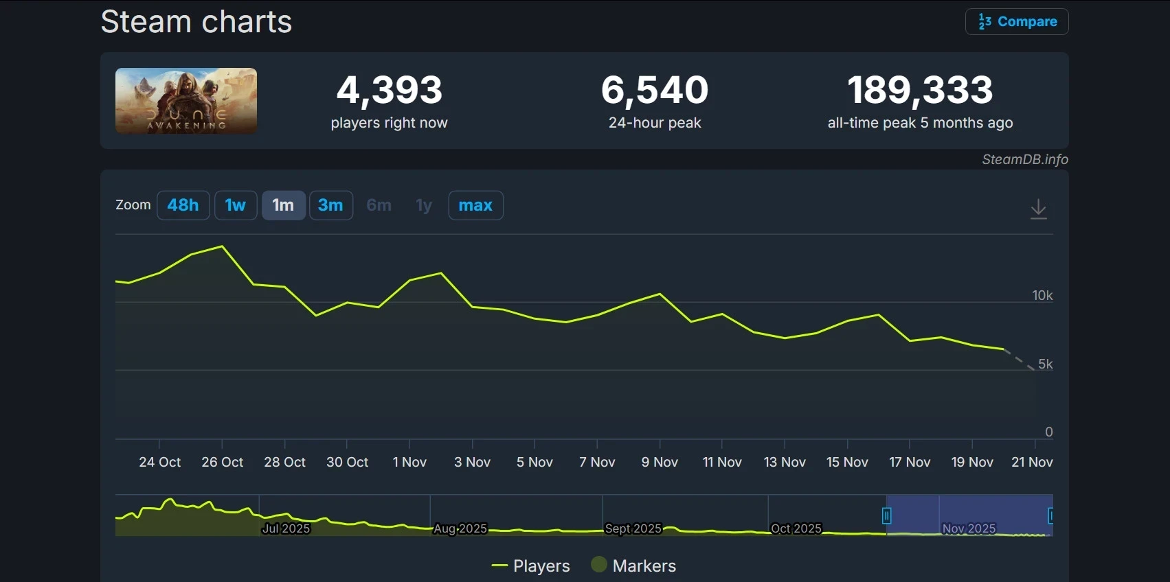 Судя по онлайну в Steam, пока бесплатный период не смог привлечь обширную аудиторию. За последние 24 часа в Dune: Awakening находилось чуть более 6,5 тысячи игроков — это далеко не рекорд ноября. MMORPG в целом растеряла фанатов и уступила по онлайну конкурентам. Однако ситуация может измениться в лучшую сторону ближе к вечеру или на выходных.